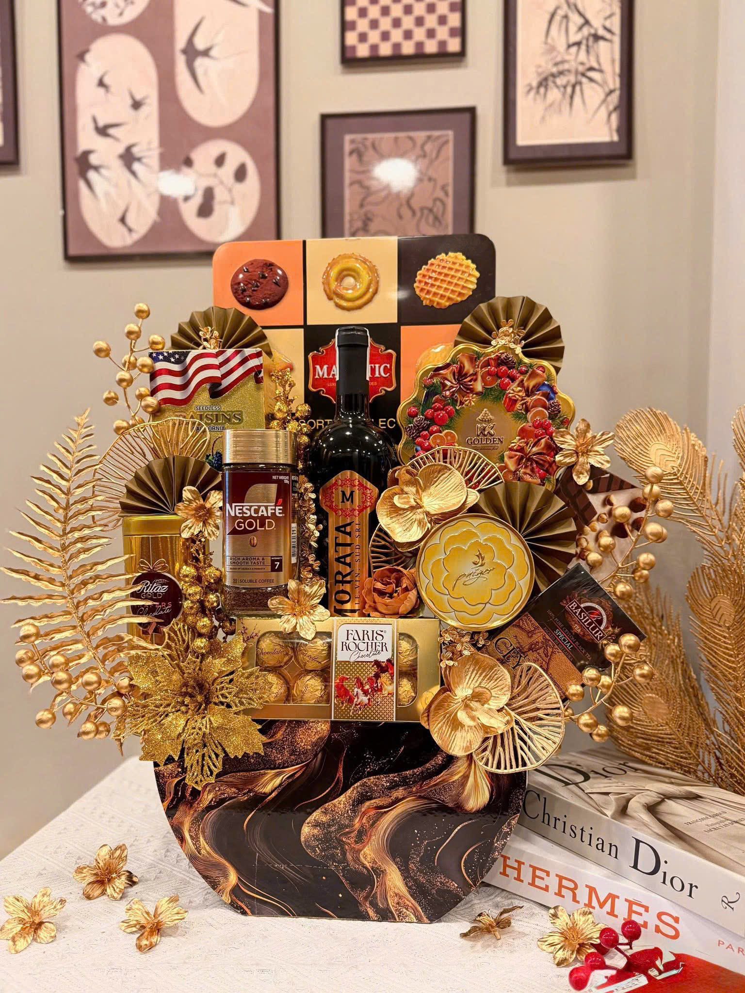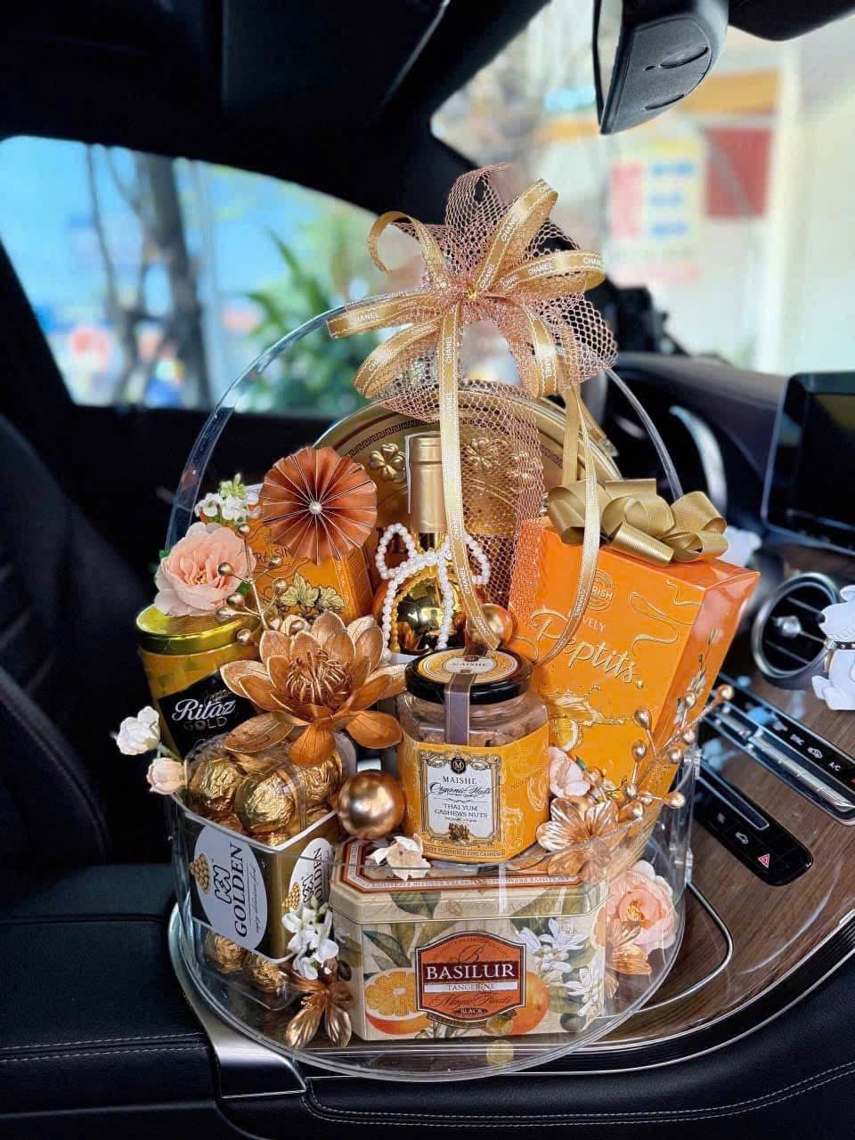| Giỏ quà Tết cao cấp | Rượu vang nhập – Hạt mắc ca – Socola – Trà cao cấp | ≈ 1.700.000 – 2.200.000 đ/giỏ |